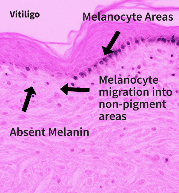 The involved patches of skin become lighter or white. It’s unclear exactly what causes these pigment cells to fail