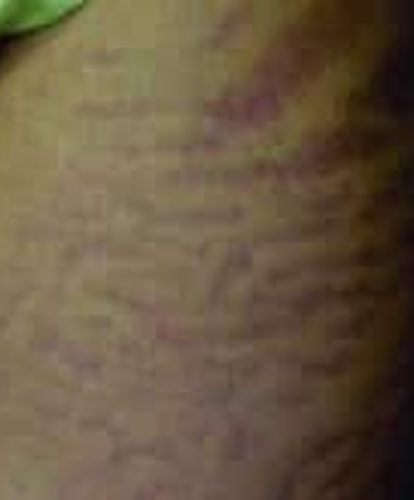 Stretch marks can be caused by an overextension of the skin. Can be found on men and women but 2x more frequent on women. There is little evidence for avoidance other than well moisturized skin. Stretch marks tend to start as red discoloration and age to atrophic white stretch marks