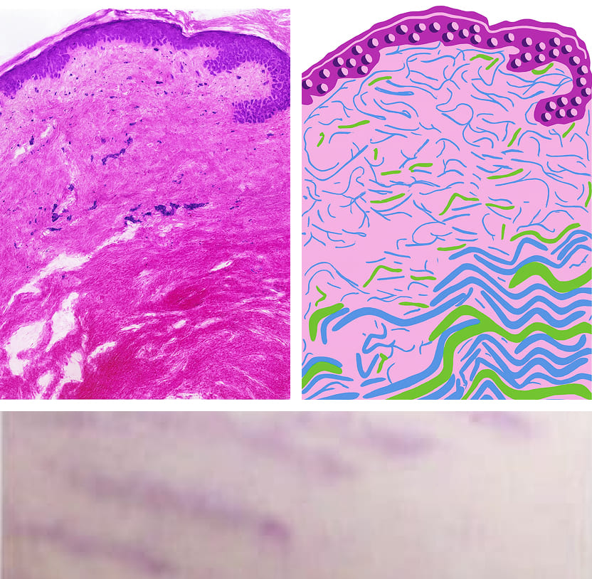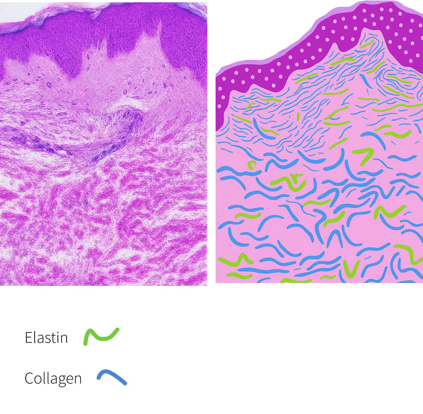Smooth and elastic with intact collagen and elastin fibers maintaining firmness and structure.